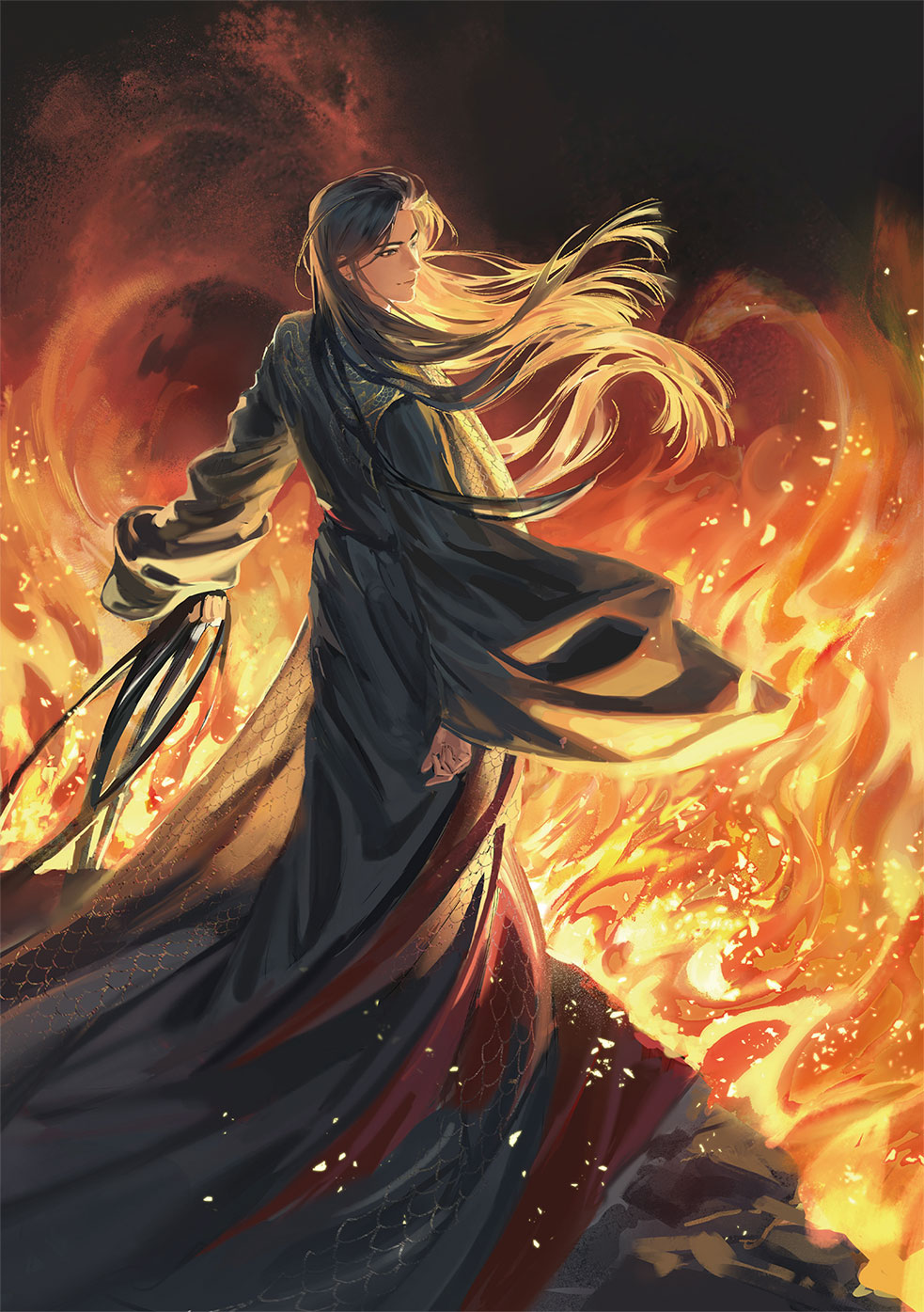 И тут он врезался в толщу лавы. Ее поверхность была покрыта твердой коркой, но тело бывшего императора оказалось настолько прочным, что от столкновения не рассыпалось в прах, пускай и упало с головокружительной высоты. Позвоночник переломился пополам, с его треском проломилась и лавовая корка. Подобно знамени взвилось высокое пламя. Огонь, «способный расплавить что золото, что нефрит», распахнул свой зев и поглотил Шэн Сяо.