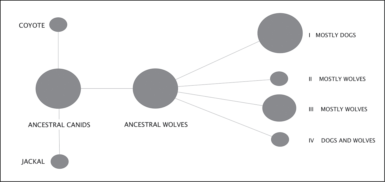 Had Darwin been alive to read it, he would have been itching to know where wolves, coyotes and jackals fitted into the tree, if at all. The answer was very clear. The coyote and jackal fell out of the main wolf/dog tree, as it were, immediately. Their DNA sequences were clearly quite different to all the dogs, and none made it into any of the four major branches. When it came to placing the wolf DNA sequences, the answer was equally striking, not because they were outside the dog tree but because they were deeply embedded within it. There was no doubt, from the mitochondrial DNA analysis, that all dogs were descended from wolves and from no other species. It was the first triumph of molecular genetics as applied to dogs – and by no means the last.