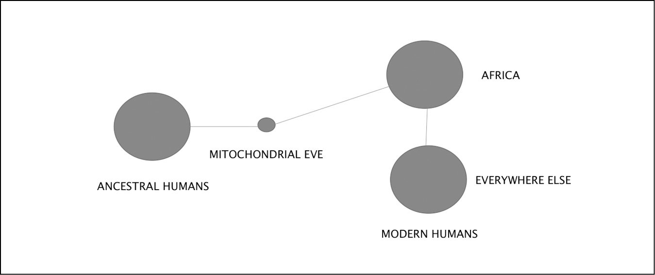 The striking conclusion of this work was that if you went back far enough, everyone on the planet has inherited his or her mDNA from just one woman. In ways that we will come on to, Wilson estimated that she lived in Africa about 200,000 years ago. Unsurprisingly, she was immediately dubbed ‘Mitochondrial Eve’. The results also showed a clear connection between Africans and everyone else, suggesting that modern humans spent a long time in Africa before some of them left to populate the rest of the world. It’s as well to remind ourselves here that we are only considering strict female–female matrilineal inheritance, with no consideration, for now, given to the DNA from men.