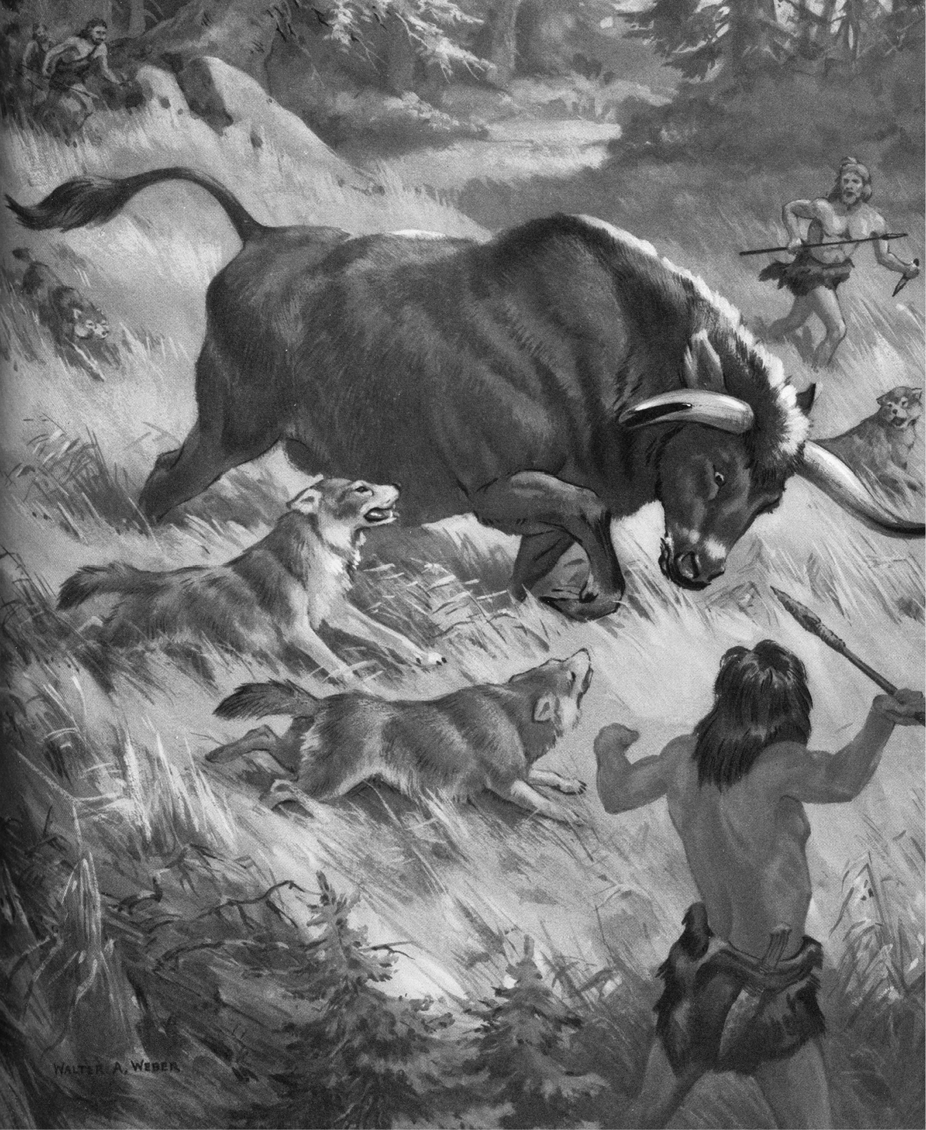 An Artist’s recreation of what a collaborative hunt, like Lupa’s, might have looked like. The wolves harry the aurochs, tiring it out, while the humans inflict the killing wounds from a safe distance. (© GraphicaArtis)