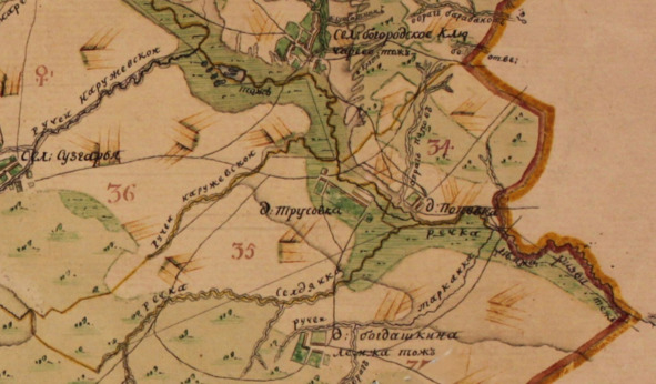 План генерального межевания (ПГМ) Шишкеевского уезда 1792 г.5 Шишкеевский уезд существовал с 1780 по 1797, в этот период Трусовка входила в его состав. После его упразднения отнесена к Инсарскому уезду, в котором и находилась до революционного периода