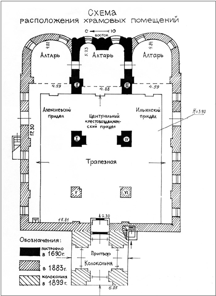 «Эта церковь по времени своей постройки относится к XVI века и уцелевшие до наших времен остатки ея должны быть охранены от дальнейших искажений, – писали архитекторы, полагая, что в конце XVII века к древней церкви был пристроен придел с северной стороны и трапезная во всю ширину этого придела и древней церкви. В это же время был перестроен алтарь в теперешний троечастный, – причем два полукружия составили алтарь древней церкви, а одно, северное – алтарь придела. На горнем месте главного алтаря, в простенке между двумя полукружиями, устроена впадина для епископского седалища».