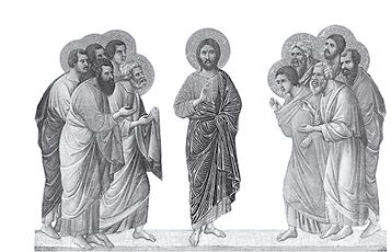 Апостолы Петр и Иоанн исцеляют у Красных ворот человека, «хромого от чрева матери» (см. Деян. 3, 1–9).