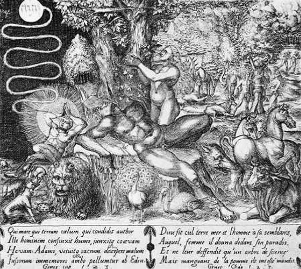 Потом, по повелению Божию, Адам дал имена всем зверям и птицам небесным, но не нашел среди них себе друга и помощника, подобного себе. Тогда Бог навел на Адама крепкий сон; и когда он уснул, взял одно из ребер его и закрыл то место плотью (телом). И создал Бог из ребра, взятого у человека, жену. Адам назвал ее Евою, то есть матерью людей.