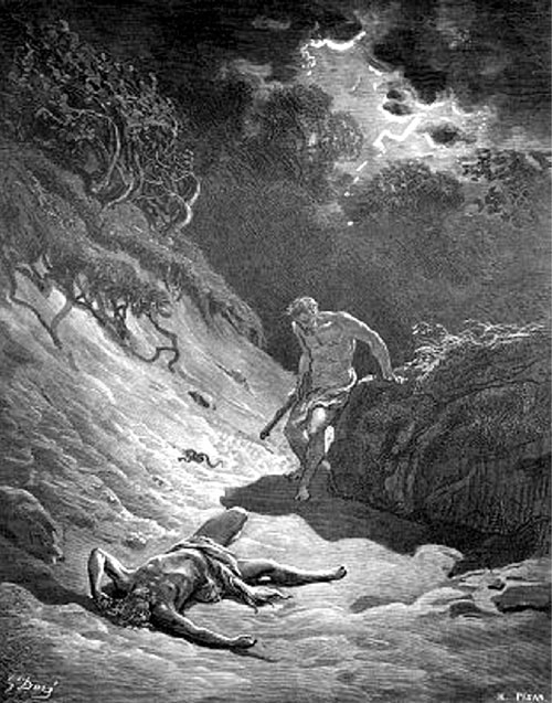 Бог обратился к Каину, желая, чтобы он покаялся, и спросил его: «Где брат твой Авель?» Каин дерзко ответил: «Не знаю; разве я сторож брату моему?» Тогда Бог сказал ему: «Что ты сделал? Кровь брата твоего вопиет ко Мне от земли. За это ты будешь проклят и будешь скитаться по земле». И Каин, мучимый совестью, с женою бежал от своих родителей в другую землю.