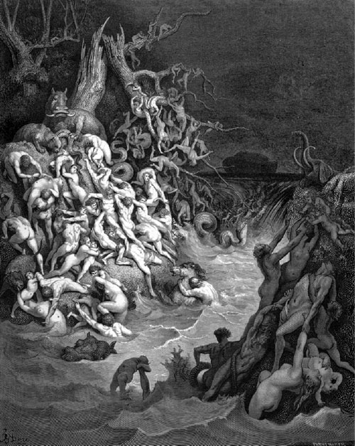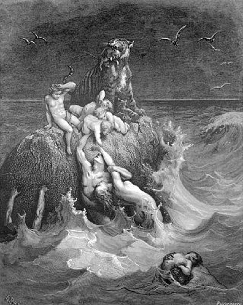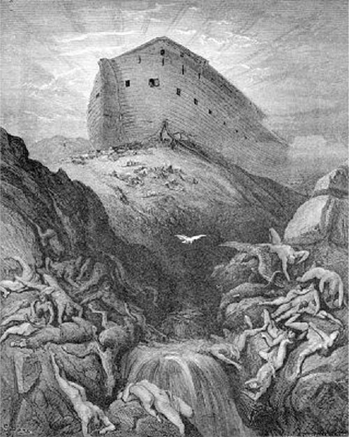В тот день, когда Ной вошел в ковчег, воды потопа хлынули на землю – «разверзлись все источники великой бездны, и окна небесные отворились», то есть произошло великое наводнение с морей и океанов, а с неба лился на землю дождь сорок дней и сорок ночей. И поднялась вода на земле выше самых высоких гор, усиливаясь сто пятьдесят дней, и потопила всех людей и животных, так что никто уже не мог спастись, кроме тех, кто был в ковчеге.