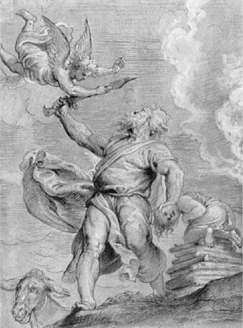 Авраам ответил: «Господь усмотрит Себе агнца». И шли далее оба вместе и пришли на верх горы, на место, указанное Господом. Там Авраам устроил жертвенник, разложил дрова, связал сына своего Исаака и положил его на жертвенник поверх дров. Он уже поднял нож, чтобы заколоть своего сына. Но Ангел Господень позвал его с неба и сказал: «Авраам, Авраам! Не поднимай руки твоей на отрока и не делай над ним ничего. Ибо теперь Я знаю, что ты боишься Бога, потому что не пожалел единственного твоего сына для Меня». И увидел Авраам невдалеке барана, запутавшегося в кустарнике, и принес его в жертву вместо Исаака.