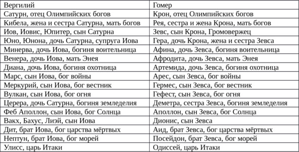 Считается, что действующий состав Олимпийской семьи богов у Вергилия полностью соответствует составу семьи Олимпийских богов у Гомера. Однако Вергилий присваивает богам кардинально иные имена, не звучащие у Гомера, и это странно. В «ИЛИАДЕ» и «ОДИССЕЕ» Гомера нет ни малейшего намёка на то, что царь Эней, один из основных защитников Илиона называет Олимпийских богов иначе, чем Ахиллес и Агамемнон, осадившие и разгромившие Троаду и Илион. Что, Гомер не знает этого, или считает несущественным? Более того, Вергилий ни разу не упоминает имён богов Гомера, как будто не знает их, при этом Вергилию не удаётся избежать обвинений в «списывании» сюжетов «ИЛИАДЫ» и «ОДИССЕИ». Однако основные герои Гомера у Вергилия носят те же самые имена, что и у Гомера, за исключением единственного, – хитроумный Одиссей Гомера назван Вергилием Улиссом, злым и коварным выдумщиком Троянского Коня и основным вдохновителем и организатором разгрома Илиона. Эта загадка требует объяснения, которое ждёт читателя в следующих книгах. Здесь же приведём основной сравнительный список Олимпийских богов в версии Вергилия и Гомера, не вдаваясь в варианты их наименований: