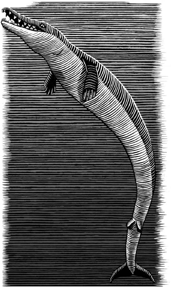 So much for the hows of fossil whales with legs. But why? What led whales to return to the water from land in the first place? That question takes us to the gap between the first and second phases of whale evolution, the gap that remains in the family tree between the branches leading to Maiacetus and Basilosaurus. In about ten million years, whales went from looking like the four-legged Pakicetus to something closer to Basilosaurus. Sometime during that interval (and probably in the last half of it), whales ambled and swam equal amounts, with shorter hind limbs and blowholes migrating backward along their snouts. And then, at some point, a generation of whales never emerged out of the water back onto land, and their descendants begat blue whales, humpbacks, sperm whales, dolphins, and every other living whale species (along with many extinct ones, like Kellogg’s finds from the Miocene).