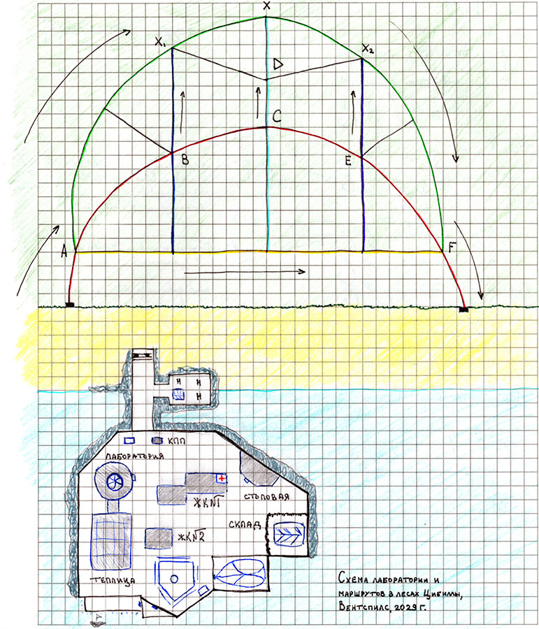 Схема лаборатории и маршрутов в лесах Цибиллы, Вентспилс, 2029 г.