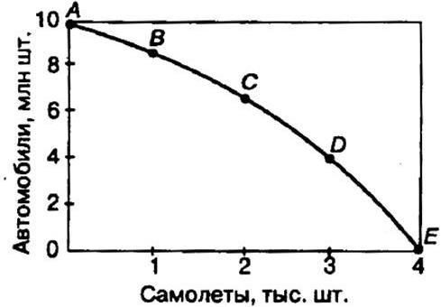 Упрощенно представим, что страна производит только два товара – автомобили и самолеты. Если она сконцентрирует все свои экономические ресурсы на выпуске только автомобилей, то сможет за год выпустить их 10 млн. шт. Если ей надо производить также 1 тыс. самолетов, то это возможно при сокращении выпуска автомобилей до 9 млн. шт. Для производства 2 тыс. самолетов придется сократить выпуск автомобилей до 7 млн. шт., а для производства 3 тыс. самолетов – до 4 млн. шт. При производстве 4 тыс. самолетов страна вынуждена вообще отказаться от выпуска автомобилей (табл. 2.1 и рис. 2.1).
