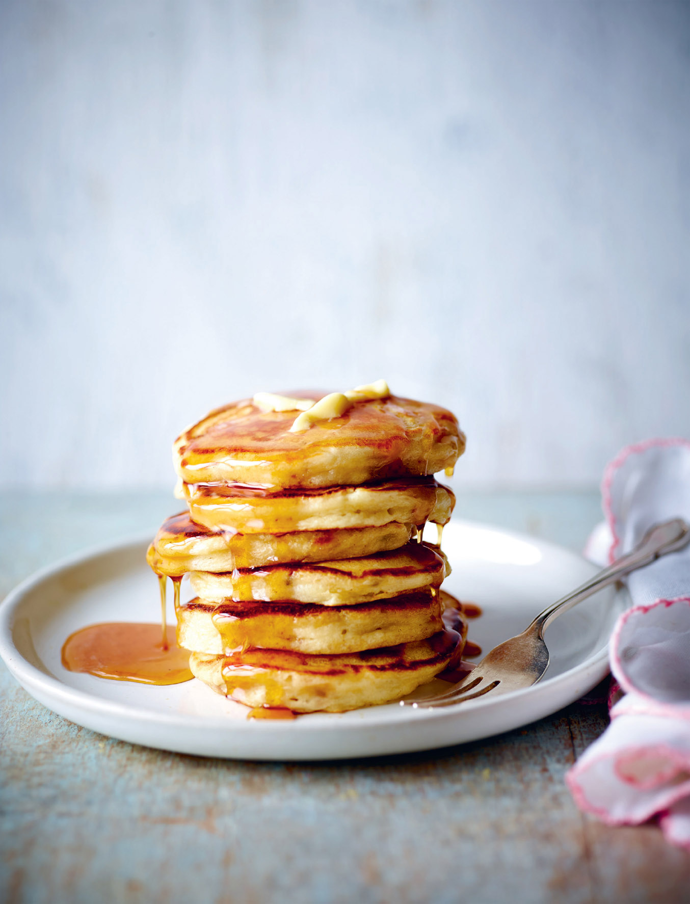 5. Drop large spoonfuls (about 50ml/2fl oz each) of the pancake batter into the hot pan – leave plenty of space between them as the pancakes spread while cooking. Turn the heat down slightly or the pancakes will burn before they’re cooked in the centre. You should be able to fit four or five in the pan at a time. Cook on the first side until bubbles appear and pop on the upper surface – 1–2 minutes – then, using a fish slice or something similar, turn the pancakes over and finish cooking on the other side for another minute or so until golden brown. Cook all the pancakes in this way in a few batches, keeping the cooked ones warm in a low oven until they are all ready. Serve with butter or maple syrup – or both.