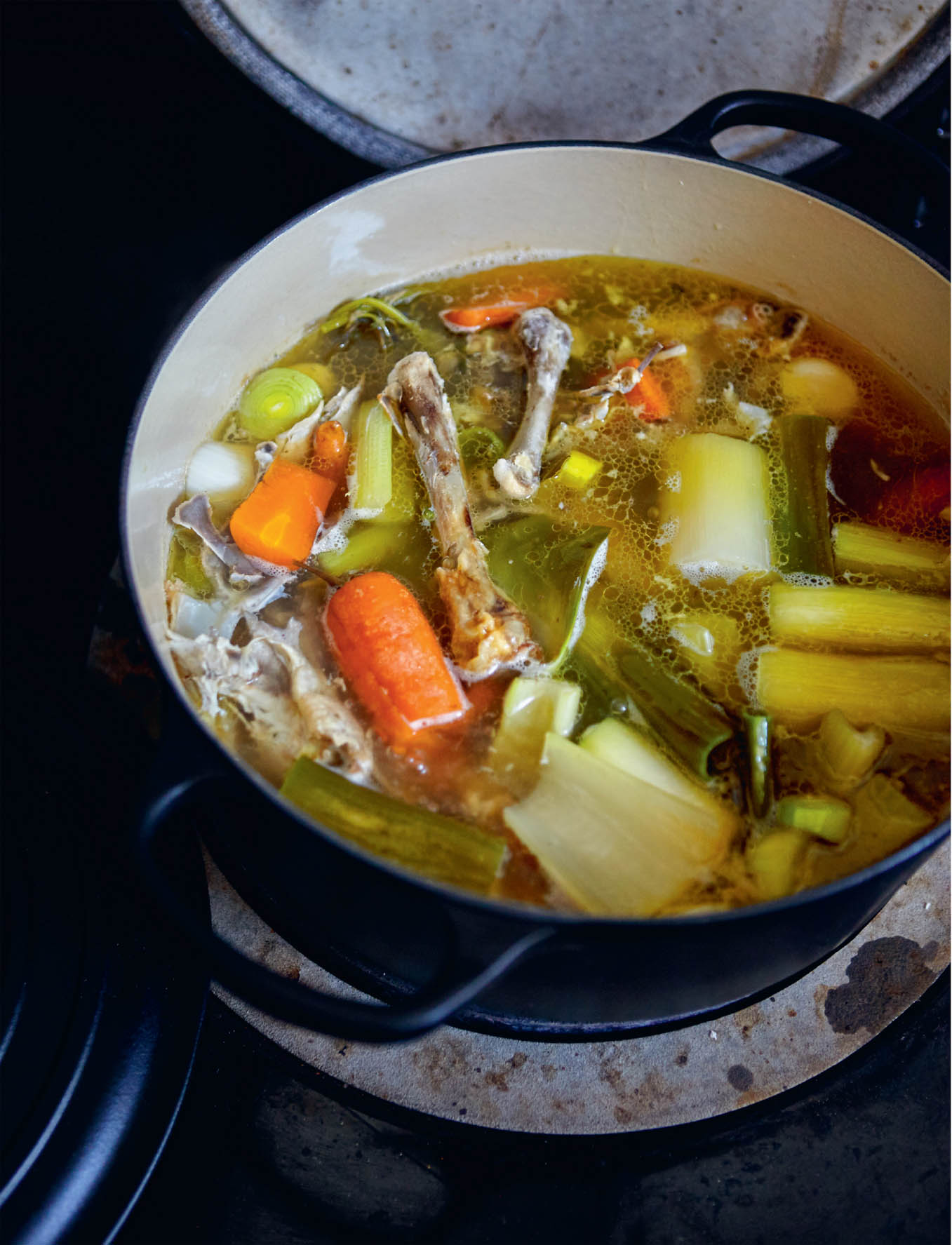 I always have a pot of chicken stock on the go. When you’re using good chickens for roasting or braising, it’s crazy not to boil up the bones afterwards. There’s an old South American proverb that says, ‘Good broth will resurrect the dead,’ and it’s not far wrong as the nutritional content of a homemade stock indeed has miraculous qualities if eaten regularly. Our great-grandmothers were right after all.