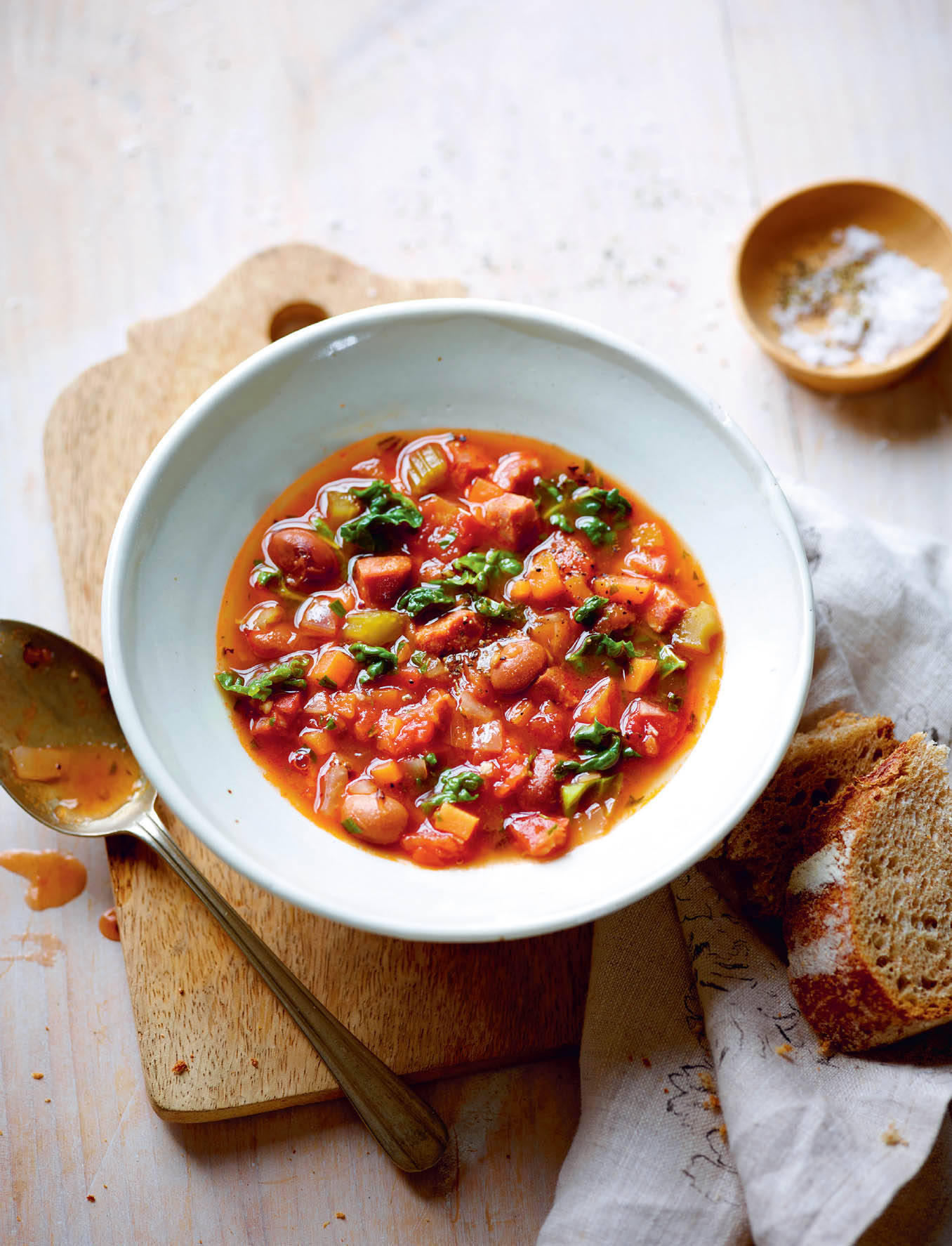 I have a problem with chorizo, in that I cannot get enough of the stuff. It has an amazing ability to give its characteristic kick to everything – from chicken and shellfish to pulses and grains. This is the kind of chunky soup that I adore; full of flavour and bursting with goodness.