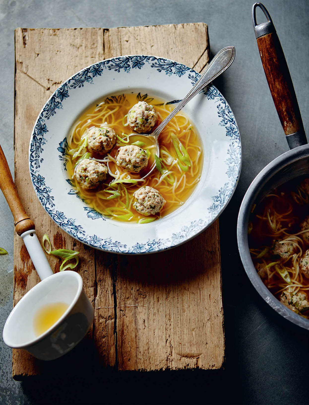 A twist on the age-old Asian dumpling soup, this is deeply satisfying and wonderfully restorative. The better the chicken stock, the better the soup.