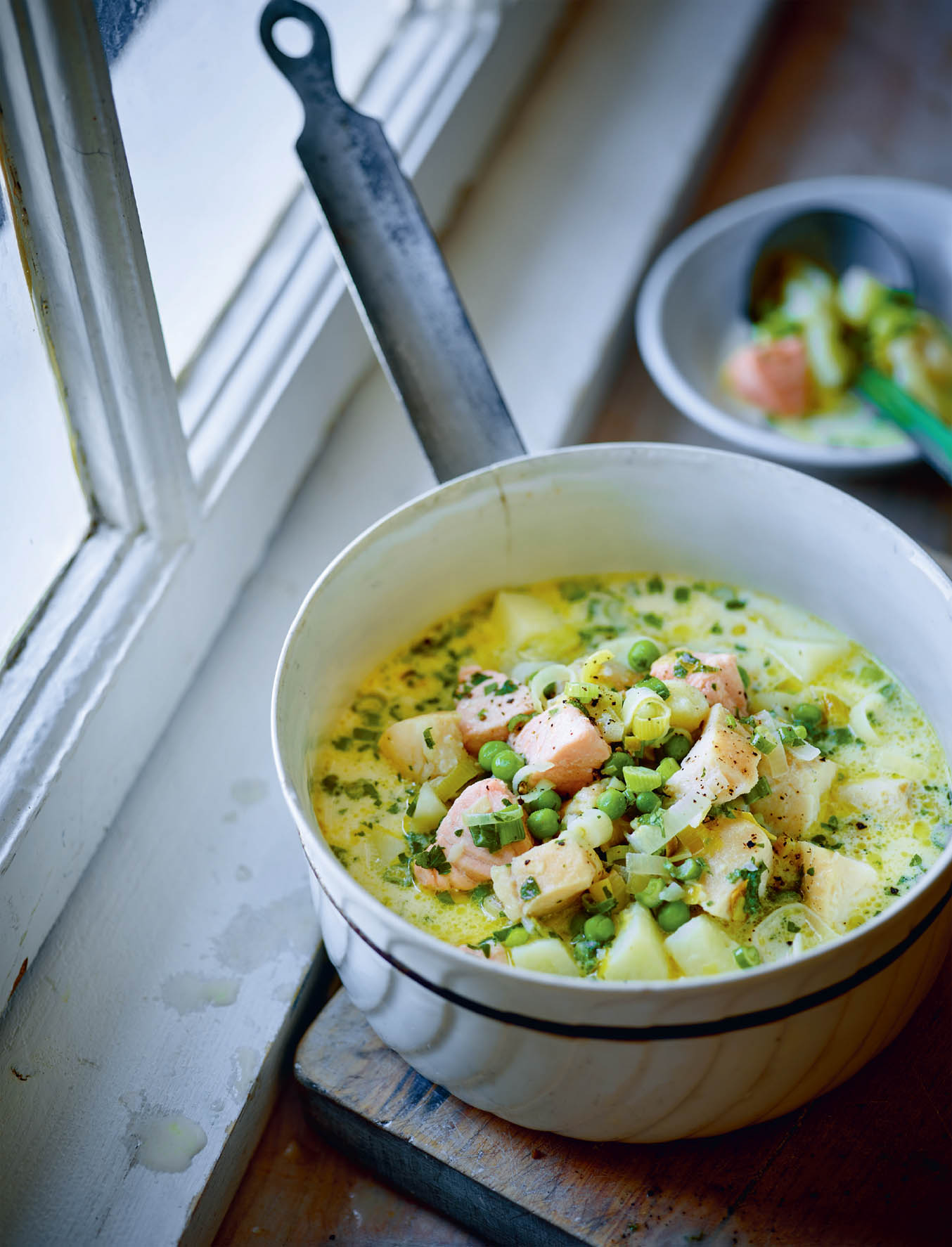 3. Add the smoked haddock, salmon, peas and the green parts of the spring onions. Cook for a further 5 minutes, then add the cream and chopped parsley and cook for a further 2–3 minutes. Serve piping hot.