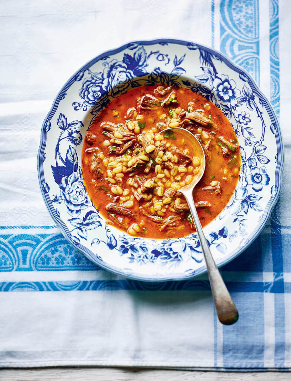 4. It’s a bit fiddly, but pick all the meat from the cooled oxtail bones and discard the bones and fat. This takes a little while but it is worth it. Pull the meat apart with your fingers then add the shreds to the casserole with the skimmed liquid and pearl barley and cook for 45 minutes over a medium heat. Taste and adjust the seasoning.