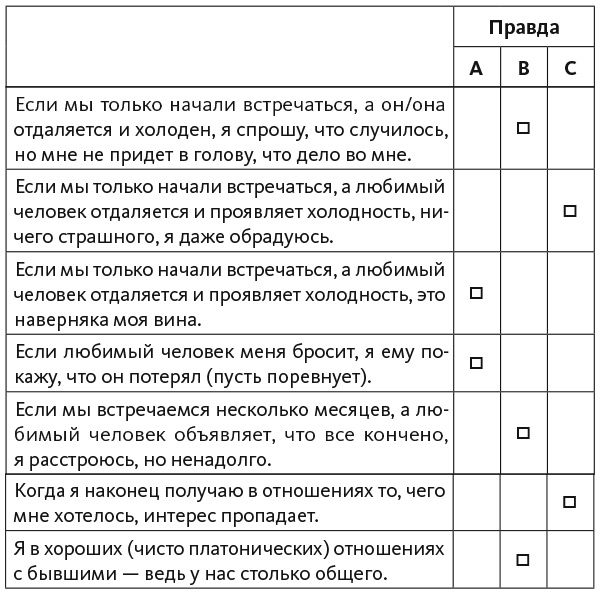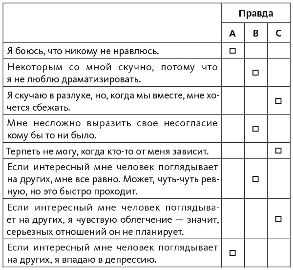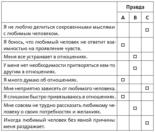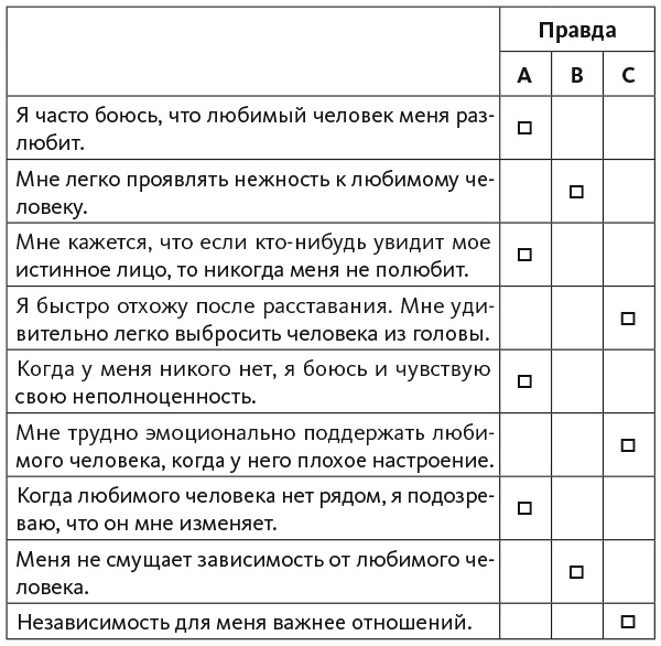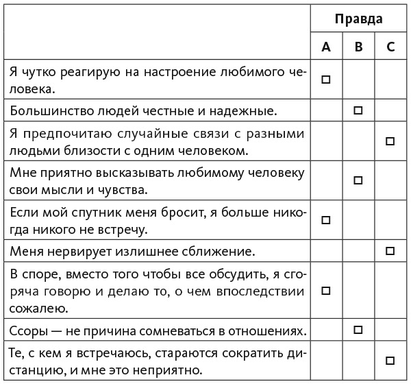 Чем больше ответов в одной категории, тем ближе вы к соответствующему типу: А – тревожный, В – надежный, С – избегающий.