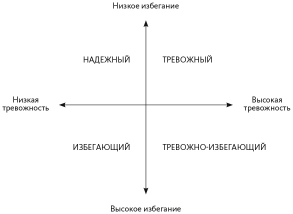 Нам кажется очень удобной схема Бреннан и ее коллег, поскольку она дает широкое представление о взаимосвязи типов привязанности. Тип определяется вашим положением на графике.