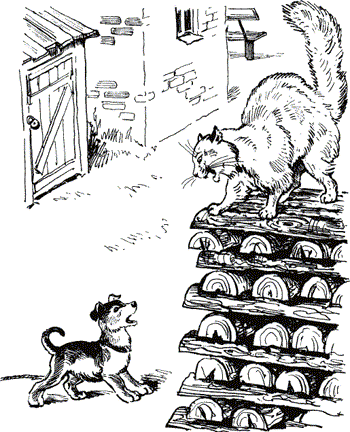 Вдруг с поленницы прямо на Пирата свалился Горыныч. Кешка выпустил поводок. Потом они с Толиком бросились было спасать щенка, но Горыныч так громко зашипел и так распушил свой хвост, что столкновение с ним грозило кончиться плохо. Пират пустился бежать, но Горыныч одним прыжком настиг его и повалил. Щенок жалобно заскулил, а кот стал над ним, покатал его лапой, словно клубок ниток, и уселся рядом.
