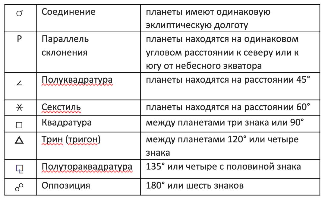 Необходимо иметь в виду, что все эти аспекты имеют разную силу. Соединения и оппозиции являются наиболее мощными, следом по силе – параллель, далее – квадратура, трин и секстиль, имеющие приблизительно одинаковую мощность, потом – полуквадратура и полутораквадратура.