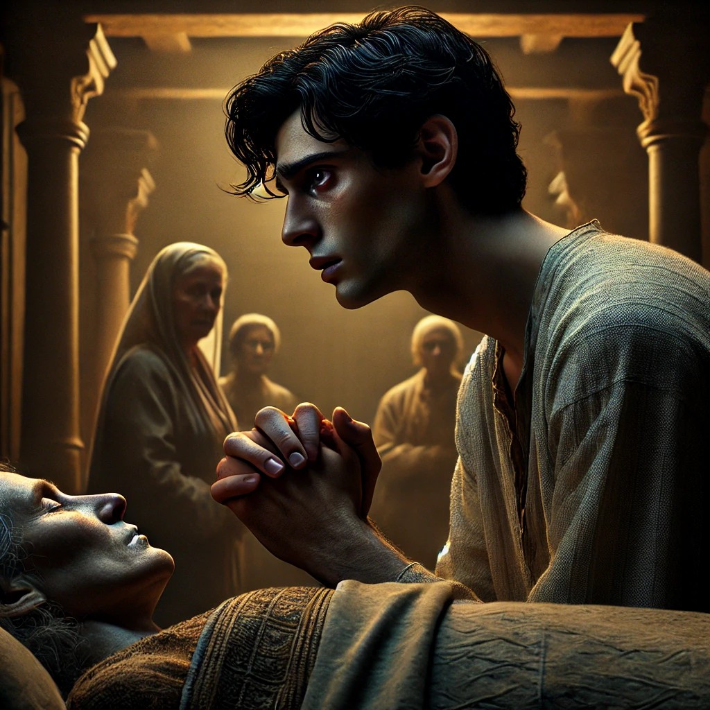 Он шагнул вперёд и позвал громче. Но в ответ – лишь пустота. Его сердце сжалось от страшного предчувствия. На дрожащих ногах он направился к кровати, вытянул руки и нащупал её руку…