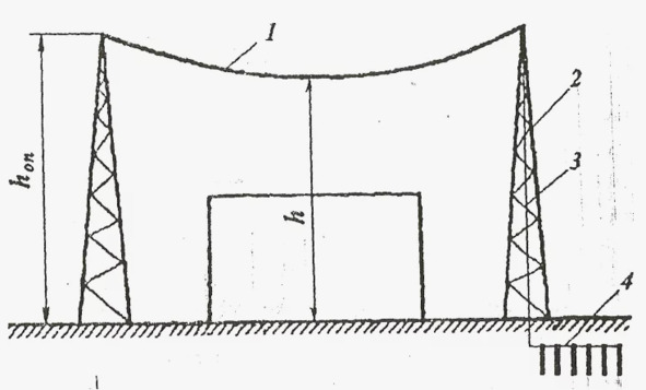 Расм 3.2 Тросли яшин қайтаргич қурилмаси: hоп– таянч баландлиги; h – тросни минимал баландлиги; 1-яшин қабул қилувчи; 2-кўтарувчи конструкция; 3-ток ўтказувчи (қочирувчи); 4- ерлатгич (ерга улагич).