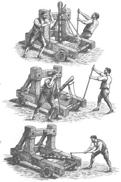 Баллиста и катапульта получают свою метательную силу от отскока сильно скрученной веревки, а требучет использует силу тяжести тяжелых грузов.