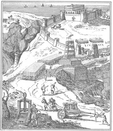 Рис. 182. Укрепленный город, который бомбардируют из катапульты.