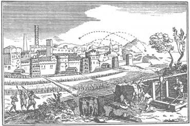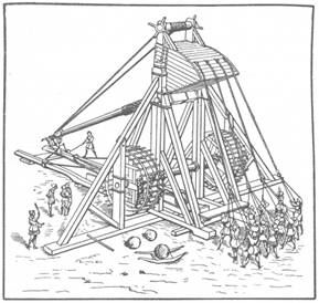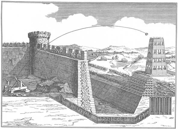 Примечание. Можно видеть как камни, пущенные осажденными, падают на траншеи осаждающих. Изображенная катапульта стреляет на гораздо меньшее расстояние.