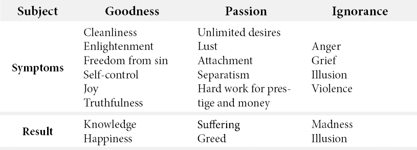 If the person is in goodness he experiences happiness, contentment and is able to hear his intuition. If we do not experience these symptoms, it means we are bound by passion and ignorance. If everything surrounding us becomes permeated by goodness, it permeates us as well. Ignorance and passion come easily into our lives, but for goodness to come, we have to work first and input effort into achieving it. In order to become elevated into goodness, we must learn how to act proactively (which includes doing things in advance).