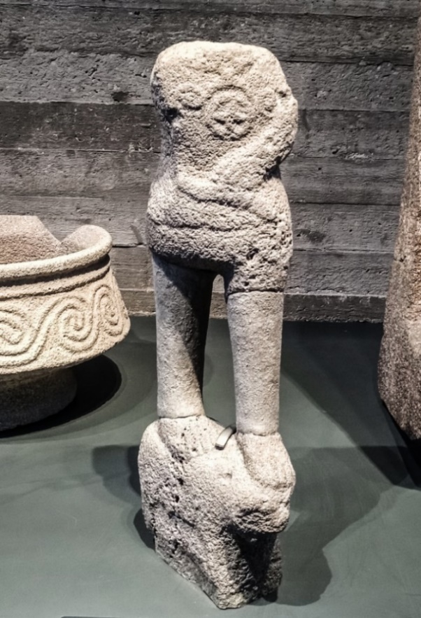 Кроме этого, рядом с постаментом нашли две фигурки, одна из которых бронзовая, крайне интересная, изображает обнажённое женское тело, вернее, художник схематически обозначил только одну половину тела: один глаз, половину носа, одну грудь и часть женского полового органа. Что хотел сказать этим древний абстракционист? Как назвать скульптурку: «Жизнь и смерть»? «Мир живых и мёртвых»? «Небо и земля»?
