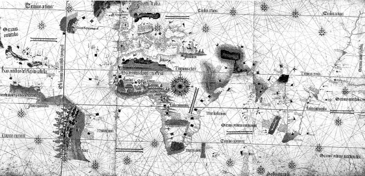 Рис. 1. Планисфера Кантино – португальская карта 1502 года. Показан берег Бразилии и проходящий через него «папский меридиан». Именно поэтому в Бразилии говорят на португальском, а в остальных странах Южной Америки – по-испански