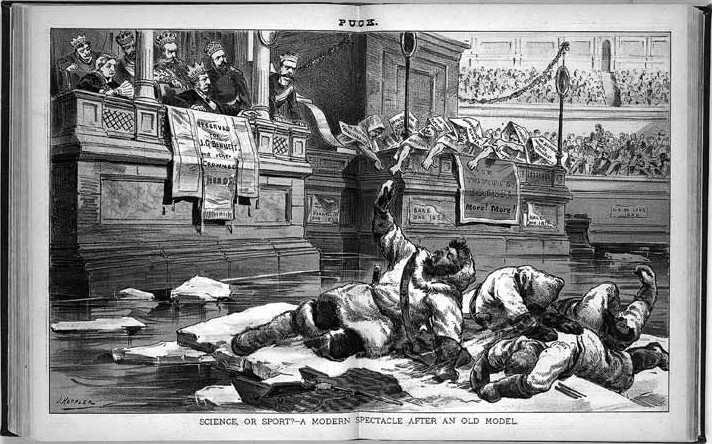 Ложа зарезервирована для «Дж. Г. Беннетта и других коронованных особ». В ней расположились монархи Австро-Венгрии, Британии, России, Испании, Швеции. Публика требует: «Ещё! Ещё! Во имя науки!» – и указывает большими пальцами вниз. Опубликовано в американском юмористическом журнале «Пак» 31 мая 1882 года. Карикатура сделана по горячим следам – в марте 1882 года стало известно о гибели Де-Лонга, найдены его останки и дневник