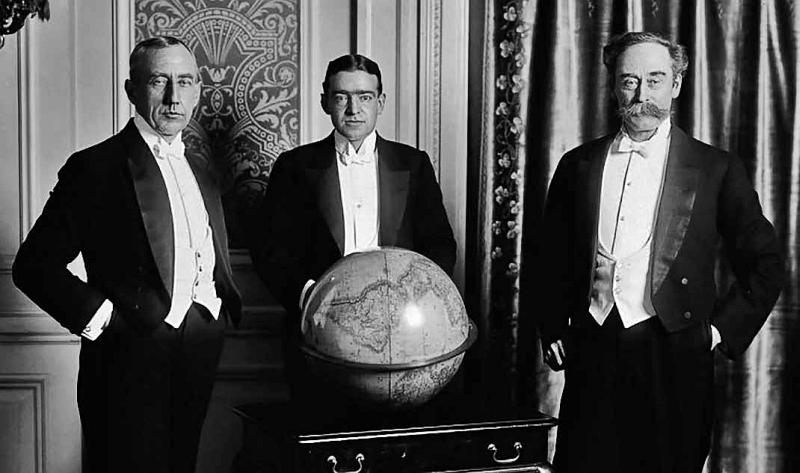 Рис. 4. Три главных героя «гонки к полюсам» – Амундсен, Шеклтон и Пири, 1913 год. Фотография, увы, показывает не всё – мёртвый Скотт в это время лежал вместе со спутниками в занесённой снегом палатке во льдах Антарктиды, а Кук уже был изгоем, хотя имел не меньшее право называться покорителем полюса, чем Пири
