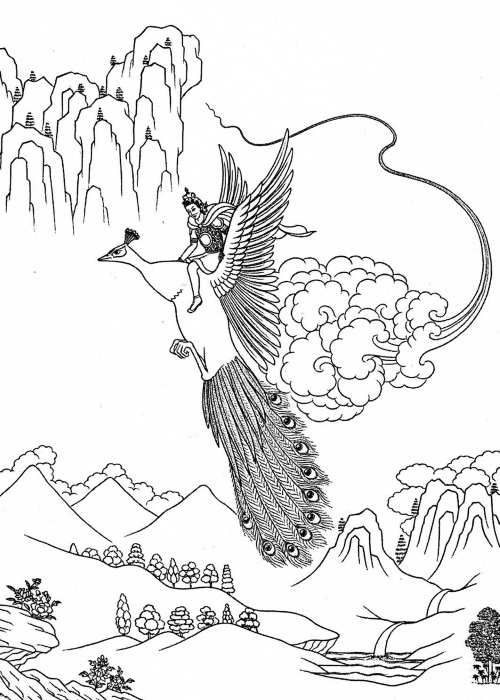 «Пусть сила благословения Трех драгоценностей,Которые никогда не лгут,А также моя чистота и высочайшие устремленияОсвободят меня от этого препятствия,опасного для жизни,И пусть выполню океан деяний Бодхисаттвы».В этот миг бог Брахма, который знал о происходящем, принял облик павлина, и юный царевич упал ему на спину. Распахнув крылья, чудесная птица полетела в землю Бир, полную лесов, пастбищ и садов, и опустилась там на землю. В этом месте Солнце и Луна провел некоторое время, медитируя на все явления обусловленного существования как на сновидение, волшебный мираж, и осознал тщетность и бессмысленность обусловленного существования, нереальность всех явлений. Солнце и Луна учил Дхарме тигров, пантер и других диких зверей, и постепенно они перестали причинять друг другу вред и стали жить вместе в мире и согласии.