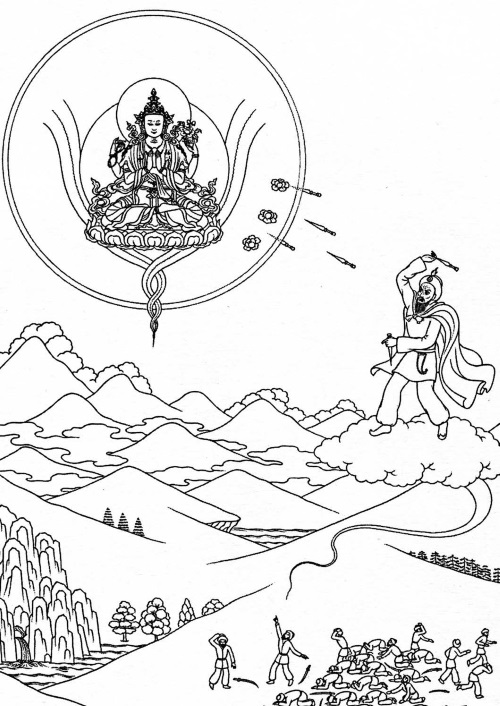 «Состояние этого существа – плод его злыхдеяний.Если я не могу отправить его в Чистую страну,Значит, мое обещание помочь всем живущимДостичь состояния Будды – бессмысленно».Приняв облик Ченрезига – Бодхисаттвы Любящие Глаза, он произнес: