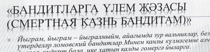 Газета «Сабанче», № 30, 31 августа 1926 г. Перевод: "Бегу, бегу не убегу, большие валенки на ногах, нас застрелили ломовские бандиты. Бери мое кровавое платье, пожалуйста, Малика, постирать. Остались 14 детей и 2 жены, будут оплакивать всю жизнь".