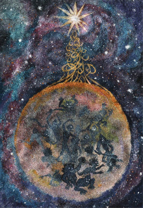 Стремительно размножаясь, они, словно перерождаясь, стали обретать в лицах нечто звериное. Абсолютно не обращая внимания на всё, что было создано для них, карлики стали вырубать и сжигать вечнозелёные леса и сады, истреблять животных и птиц, углубляться в недра планеты, нанося ей незаживающие раны и причиняя невыносимую боль. Они сооружали спиралеобразные вышки, от которых протягивали к сверкающей звёздочке нитеобразные линии. Словно высасывая из неё энергию, по всей маленькой планете стали сверкать золотистые лучи.