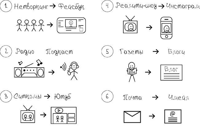 Рисунок 0.4: Блоги, подкасты и онлайн-видео – это просто новые версии старых информационных каналов вне интернета.
