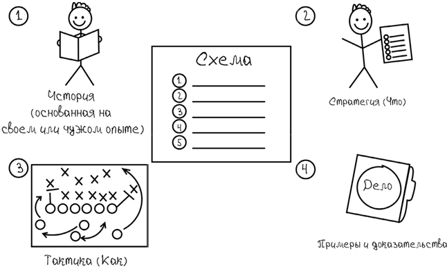 Рисунок 2.1. Чтобы обучить своей схеме, представьте ее, расскажите историю о том, как вы выработали ее, поделитесь стратегией (тем, что вы делаете), научите тактике (как вы это делаете) и покажите, как это сработало у других