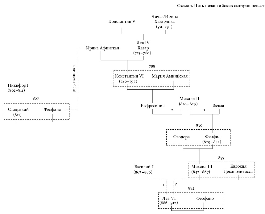 Даже среди тех, кто считает смотры невест в Византии историческим фактом, все же нет согласия в вопросе их генезиса. Стивен Рансимен и Ромилли Дженкинс полагают, что эта традиция пришла в Византию от хазар, чья империя с VII до X века простиралась на территории Половецкой степи и Северного Кавказа и чьи правители, каганы, заключали брачные союзы с членами византийских, а возможно, и ранних русских «династий»51. Первый византийский смотр невест был организован императрицей Ириной Афинской (годы жизни: 752–803) для своего сына Константина VI (годы правления: 780–797). Согласно Рансимену и Дженкинсу, императрица Ирина была вдохновлена своей свекровью, Чичак, дочерью кагана Вирхора, в крещении нареченной Ириной перед свадьбой с будущим Константином V (годы правления: 741–775) и имевшей прозвище Хазарянка, аналогично чему и ее сын Лев IV (годы правления: 775–780) имел прозвище Хазар (см. схему 1). Но, как указывает Тредголд, «эта гипотеза не слишком надежна». Чичак/Ирина Хазарянка (умерла в 750‐м) была уже мертва, когда ее внук выбирал себе в жены Марию Амнийскую на смотре невест в 788 году52. Чтобы произошла такая передача традиции от Хазарии к Византии, предполагаемая Рансименом и Дженкинсом, должно было идеально совпасть множество случайных обстоятельств. Как скептически выразился Тредголд, «Ирина Хазарянка могла рассказать своему сыну Льву [IV], который мог рассказать своей жене Ирине [Афинской] о смотрах невест, которые могли происходить в Хазарии»53. Скептицизм Тредголда оправдан, особенно учитывая отсутствие какой-либо уверенности, что такой обычай был принят у самих хазар.