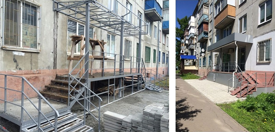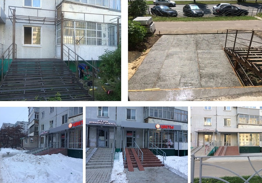 Рисунок 5. Однокомнатная квартира, перепланированная под торговое помещение. На фото видно применённые конструктивные решения: металлический каркас для долговечности и бетонная площадка перед входом, защищающая от зарастания растительностью.