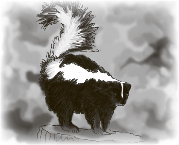 А не знакомы ли вы с «плюющимся стрелком», который расстреливает нападающих на него хищников-агрессоров, точно пулемётной очередью? Любопытный зверушка, но близко к нему не подойдёшь! Североамериканский СКУНС с ярким тёмно-белым мехом, предупреждающим хищников: «Не тронь меня, я вонючка!» Скунс не плюётся ртом, как верблюд, а поворачивается задом в сторону обидчика, поднимает хвост и, становясь на передние лапы, выбрасывает на врага струю едкой вонючей жижи.