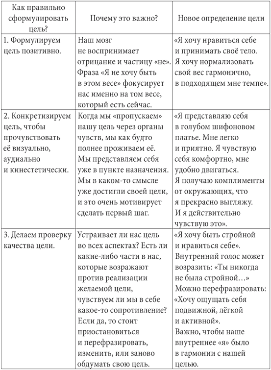 Как мы уже сказали, бывает и другая мотивация – мотивация «к». Так было у Симы, когда она пришла на консультацию будто под прессингом близких людей. Однако ей просто было плохо. Это «плохо» привело её ко мне, но, скорее всего, не заставило бы предпринимать какие-либо действия по изменению привычек. А вот когда мы сформировали сто́ящую для неё цель, её глаза загорелись, она улыбнулась и была готова «здесь и сейчас» начать поэтапно двигаться по своему новому пути.