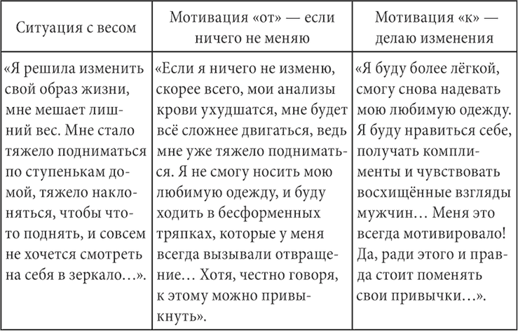 • мотивация «от» – что произойдёт, если я не буду ничего менять? Если я останусь в своём весе, со своим привычным образом жизни, с тем же питанием, с уже имеющимися привычками?