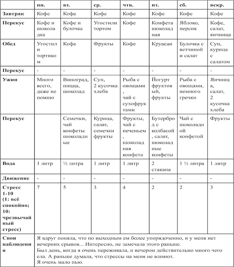 Практически все, кому я предлагаю хотя бы несколько дней записывать свою еду, закатывают глаза и протестуют. Но не только дополнительная работа нас так напрягает. Это как фото-зум на реальную картину нашего пищевого поведения. Так непросто каждый раз тормозить себя, сосредотачиваться и записывать каждый съеденный кусочек. Но то, что нам раскрывают записи, не может дать никакая техника. Ну, кроме ситуации, когда нас снимают на видео 24 часа, 7 дней в неделю. Этот вариант был бы еще более приближен к истине, но трудно осуществим.