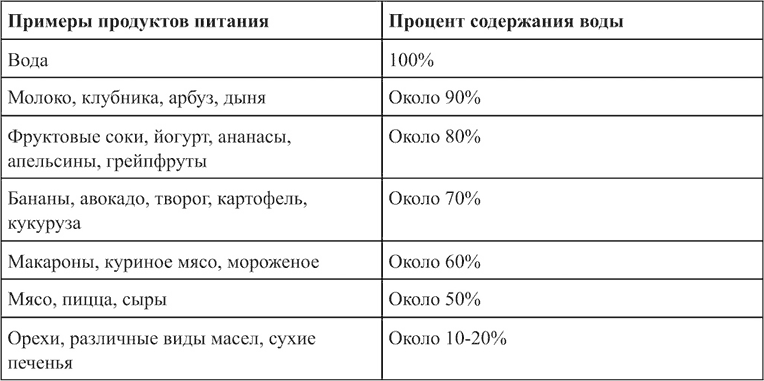 Из этой таблицы видно, что вода присутствует там, где мы даже не подозревали. Ведь мы наверняка не считали мясо или крекеры частью рекомендуемой порции суточной жидкости. А ведь организм учитывает и их тоже!
