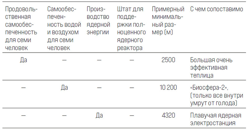 Международные стандарты ООН предписывают заводить суда в сухой док как минимум два раза в пять лет для полного осмотра, а значит, вам придется – если вы решите следовать этим стандартам – построить и поддерживать наземную инфраструктуру, без которой база не сможет функционировать. Что до автономности, то верхняя палуба «Корабля свободы» эквивалентна по площади 11 биосферам, то есть способна обеспечить воздухом и едой 77 человек в полностью герметичном окружении или 420 – если вы растите еду, но не рециркулируете воздух и воду.