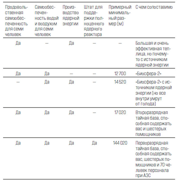 И все же! Эти затраты, драмы, страдания, голод и разрывы между друзьями позволяют нам сделать вывод, что для надежной базы с вами и шестью клевретами, выбранными за лояльность и предрасположенность не образовывать группы, не чудить и не грустить, требуется по меньшей мере 12 700 м2, где 2500 м2 отводится под сельское хозяйство. Если предпочитаете побольше обслуги, то увеличьте площадь угодий и запас кислорода – и вы в шоколаде.